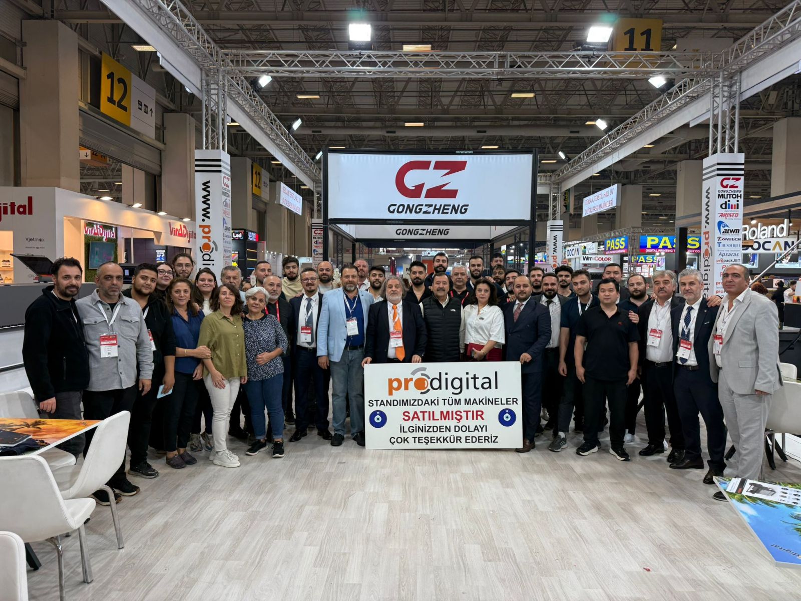 Bu yılki fuarda Prodigital, özellikle endüstriyel reklamcılığın geniş format UV baskı ihtiyaçlarına çözüm sunan makineleriyle öne çıktı. Bunlar arasında yer alan Gongzheng GZR5200KM ve Proprint AW5300KM hibrit LED UV baskı makineleri, iki farklı stantta sergilenerek ziyaretçilerin yoğun ilgisini topladı. Ayrıca Gongzheng’in yeni nesil solvent baskı çözümü GZM3204ET de kullanıcı dostu yapısı ve yüksek baskı kalitesiyle fuarın dikkat çeken modellerinden biri oldu.